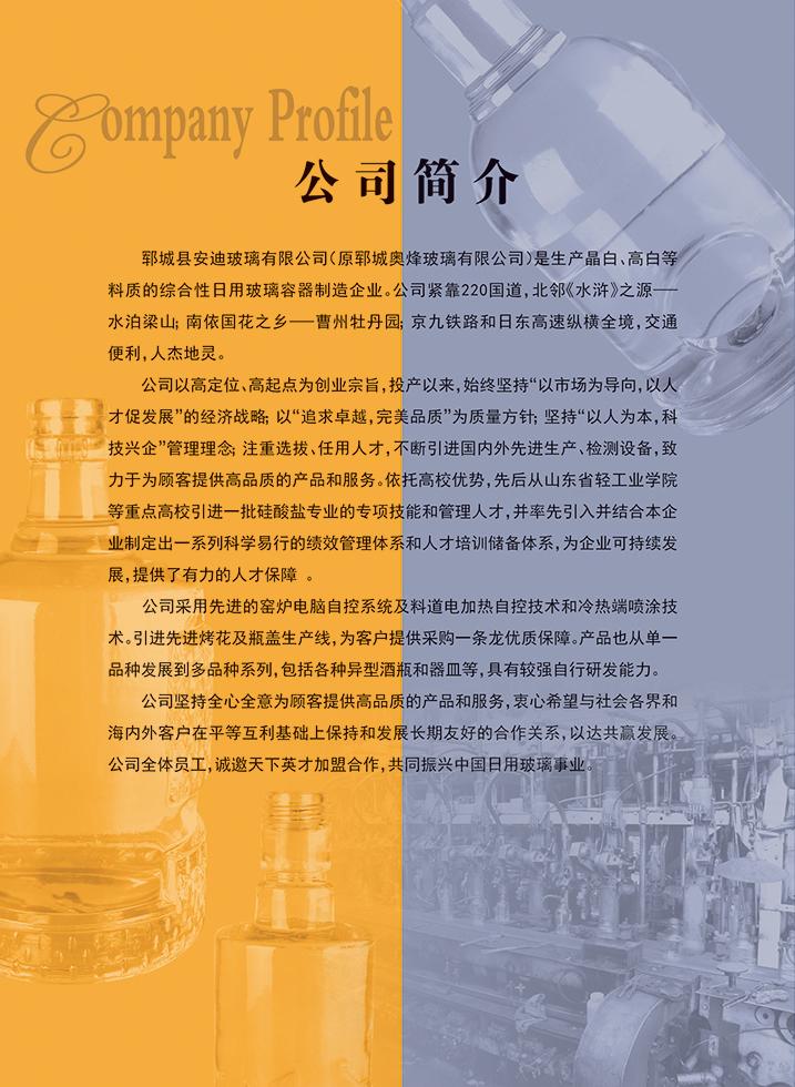 鄆城縣安迪玻璃有限公司是一家生產(chǎn)玻璃酒瓶及綜合性日用玻璃容器制造公司,緊靠220國道,北鄰《水滸》之源----水泊梁山;南依國花之鄉(xiāng)----曹州牡丹園;京九鐵路和日東高速縱橫全境,交通便利,人杰地靈。